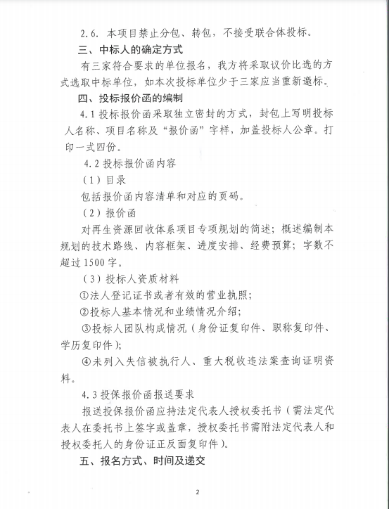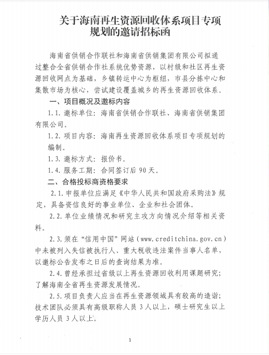 關(guān)于海南再生資源回收體系項(xiàng)目專項(xiàng)規(guī)劃的邀請(qǐng)招標(biāo)函